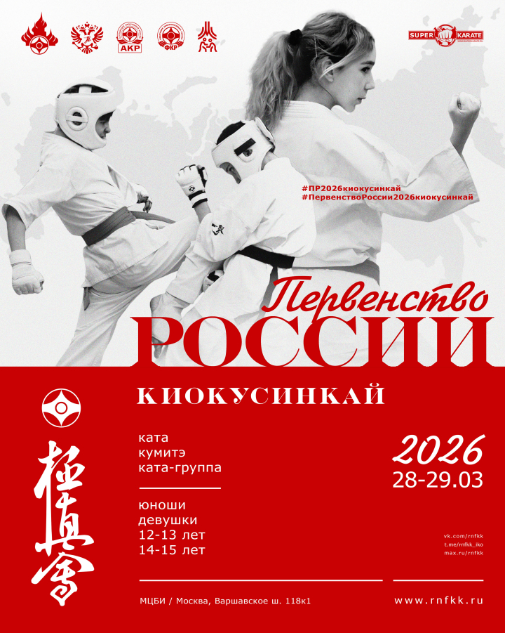 28-29 марта 2026 года в Москве пройдет Первенство России по киокушинкай (12-15 лет).Предварительные заявки на участие в турнире (приложение № 1) принимаются до 1 марта 2026 года по e-mail: rnfkk-org@yandex.ru