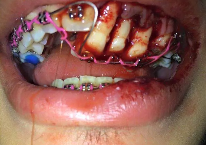 Ссадины и порезы: Если удар по рту достаточно сильный, зубы могут поцарапать или укусить окружающие области, такие как губы и щеки. Скобки от брекетов уже могут вызвать более серьезные порезы внутри рта.