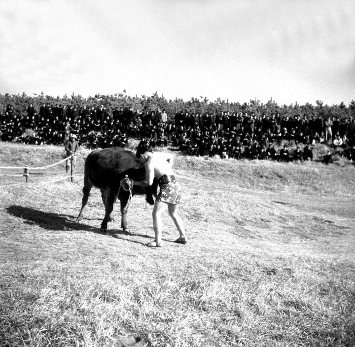 ...Токийцы, уже пресытившиеся рестлингом, роллер-дерби и другими острыми импортными зрелищами, несмотря на мелкий дождь, собрались посмотреть на бескомпромиссный бой человека с быком. Однако "свирепый бык" Райдэн-кун, испугавшись переполненного зала и вспышек фотокамер, стал кротким, как котёнок. Ояма, которому нечего было делать, пытался разозлить быка, хватая его за рога, но тщетно. В итоге бык дважды упал, пустил пену изо рта и был уведён. Чистое время боя — всего три минуты. Было невероятно скучно.