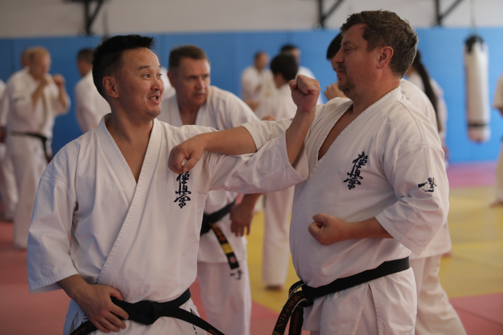 На собрании представили наставников сборов: абсолютный чемпион мира сэнсей Александр Еременко и чемпион мира в тяжелом весе сэнсей Сёки Арата.