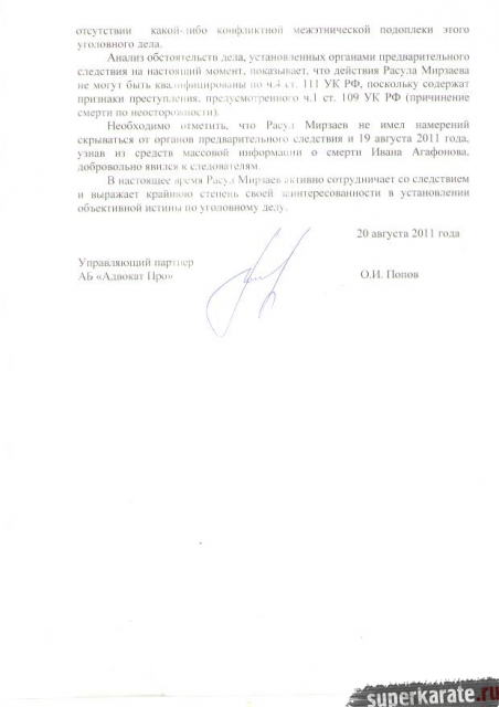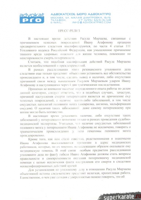 В рамках расследования этого резонансноготуголовного дела следствию еще предстоит объективно установить все обстоятельства происшедшего и, в том числе, сделать вывод о наличии, либо отсутствии причинной связи между нанесенным Расулом Мирзаевым ударом Ивану Агафонову и наступившими через 4 дня трагическими последствиями.