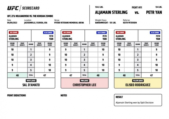 Итог боя: 48-47, 47-48, 48-47 – победу раздельным решением судей одержал Стерлинг. Очень сомнительное решение судей...