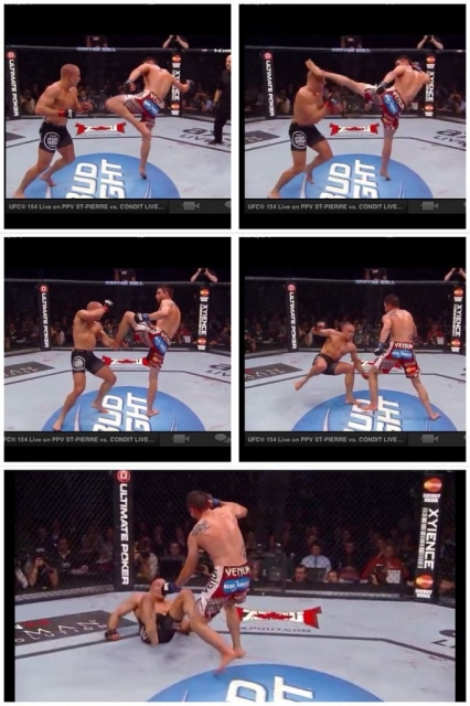 В третьем раунде кондитовская "маваха" прилетела в голову Сен-Пьеру, после чего ЖСП оказался на полу...